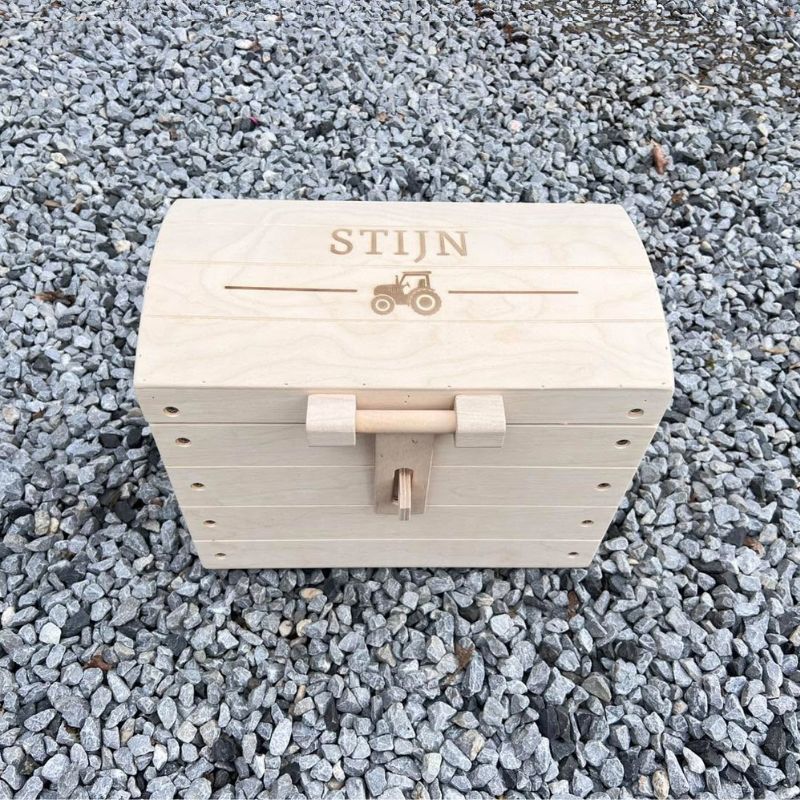 Deze persoonlijke schatkist is een uniek en tijdloos cadeau. Deze schatkist met naam is de perfect keuze! Gemaakt van hoogwaardig hout en zorgvuldig afgewerkt. Het is een veilige plek voor waardevolle spullen met een persoonlijk tintje. Gepersonaliseerd met naam en afbeelding (traktor of vlinder, hart of regenboog). Maak jouw schatkist uniek en geef een blijvende herinnering cadeau.